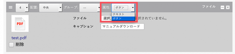 テキスト形式かボタン形式かを選択するには、ファイルユニット上部の「属性」で選択することができます。