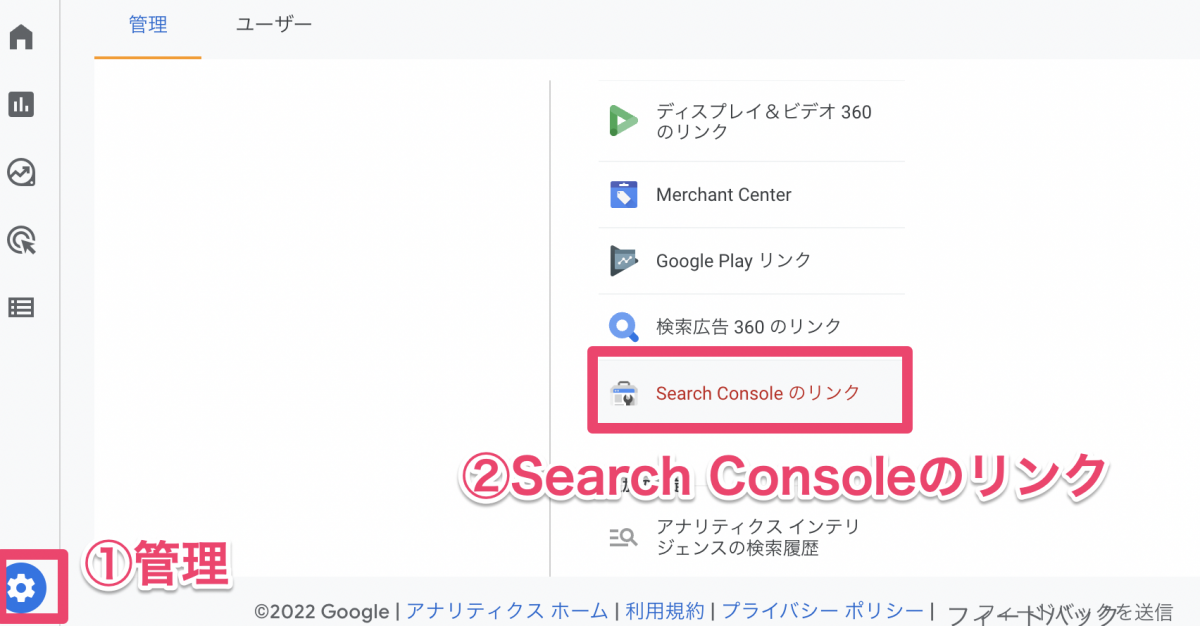 GA4画面で【管理】→メニュー下部の【Search Consoleのリンク】を選択