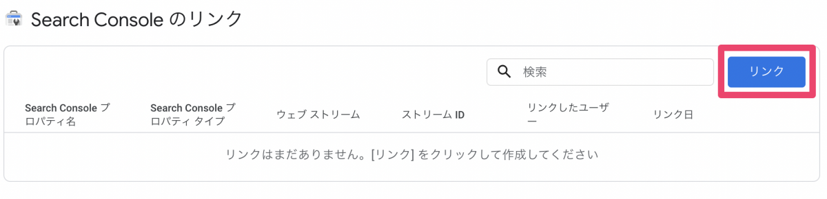 サーチコンソールのリンク設定画面が開くので、「リンク」ボタンをクリック