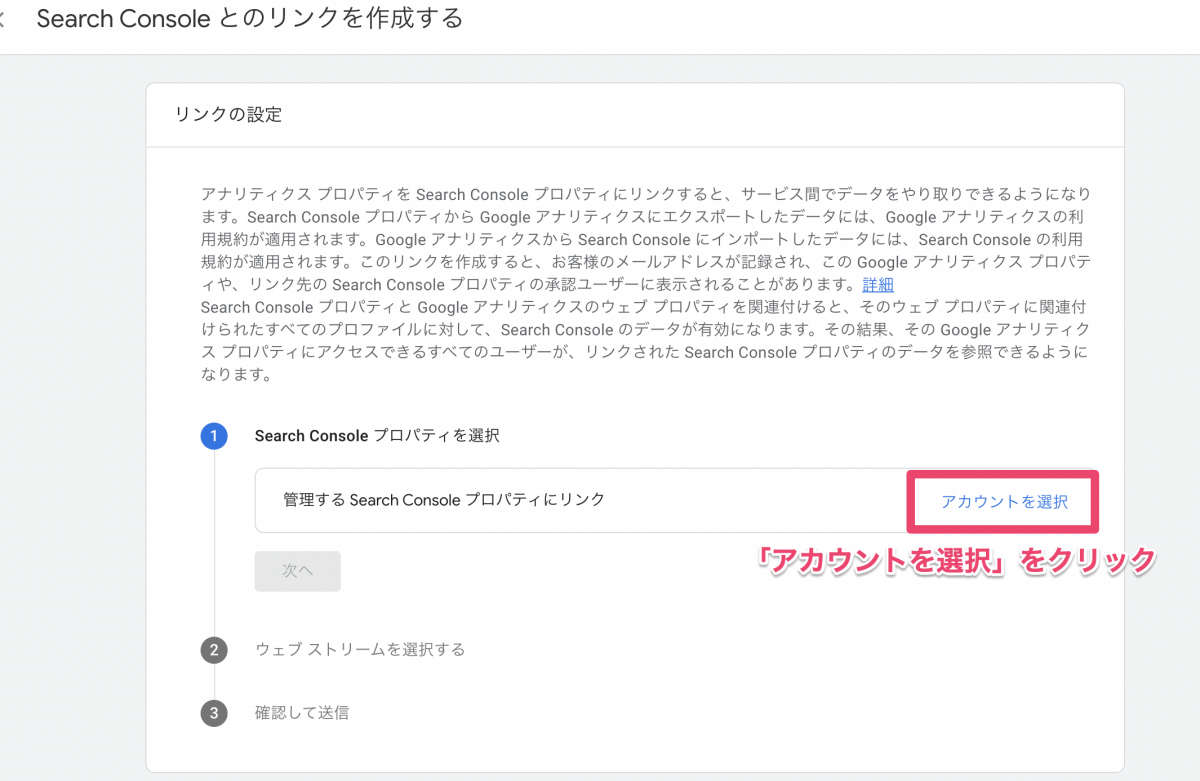 ・Google アナリティクス 4 プロパティには、Search Console プロパティにリンクされたデータ ストリームを 1 つのみ設定できます。