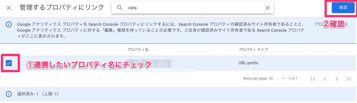 【管理するプロパティにリンク】画面が開くので、連携したいプロパティを選んでチェックします