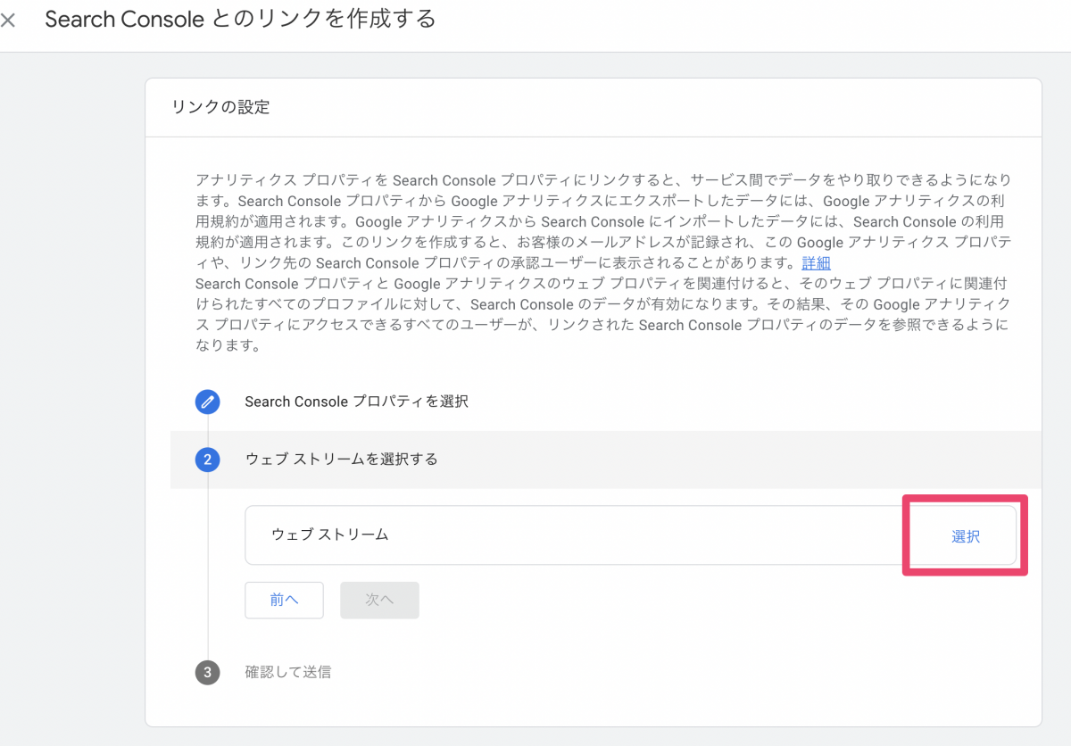 ウェブストリームを選択するの箇所で「選択」をクリックし、その後表示されるウェブストリームを選択し、「次へ」をクリック