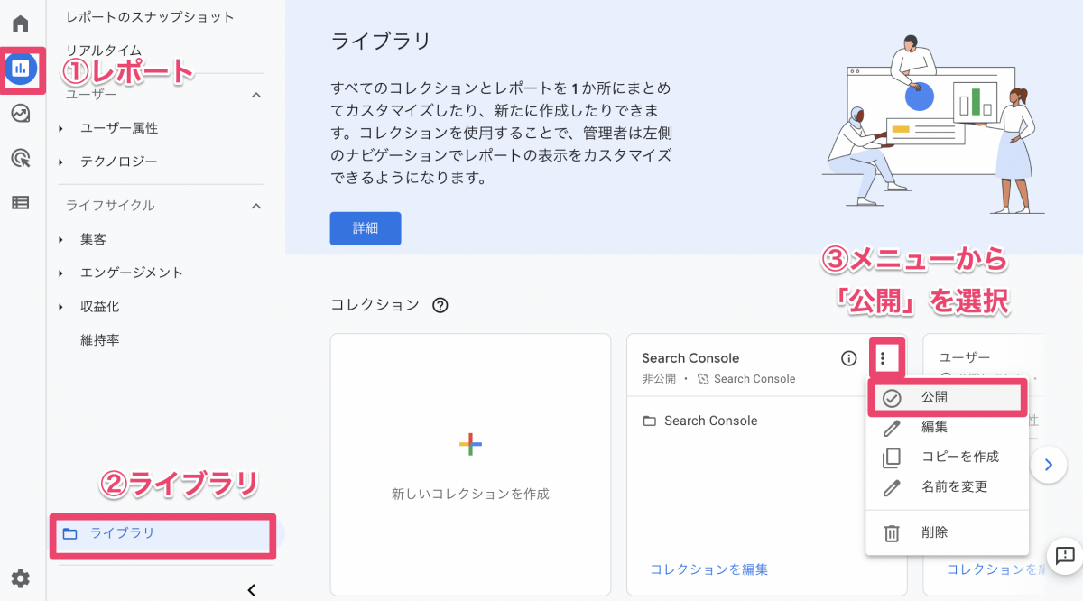【レポート】メニュー下部の【ライブラリ】を選択します。