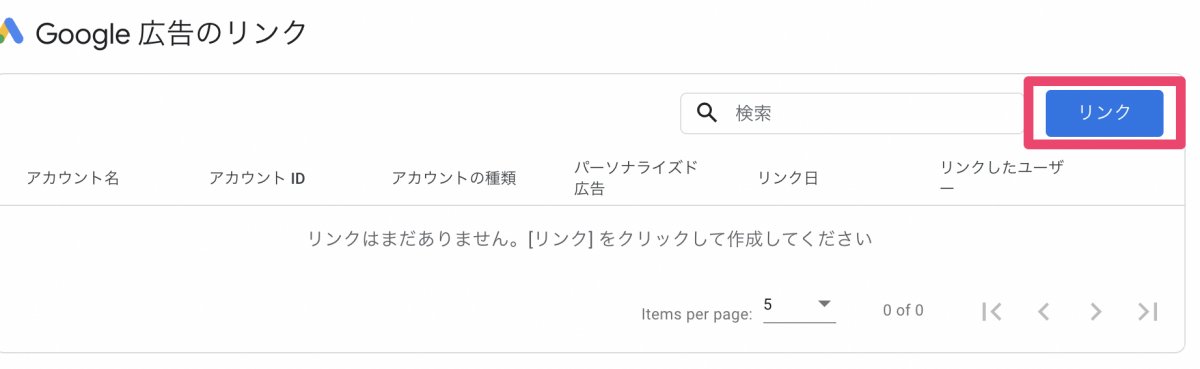 【Google広告のリンク】画面で「作成」ボタンをクリック