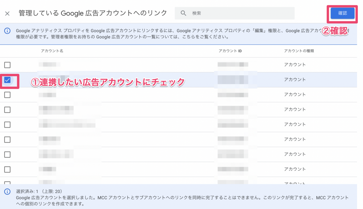 広告アカウント一覧が出てくるので、連携したいアカウントにチェックを入れて「確認」ボタンをクリック