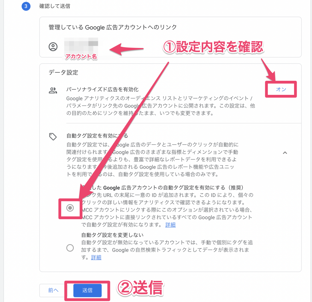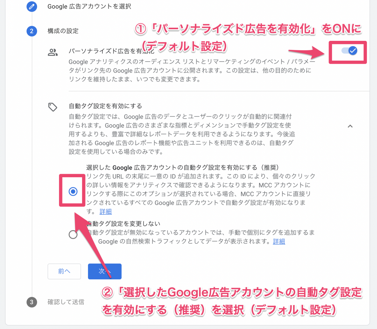 ・その下の「自動タグ設定を有効にする」は、「選択したGoogle広告アカウントの自動タグ設定を有効にする(推奨)を選択しておきます(デフォルト設定)