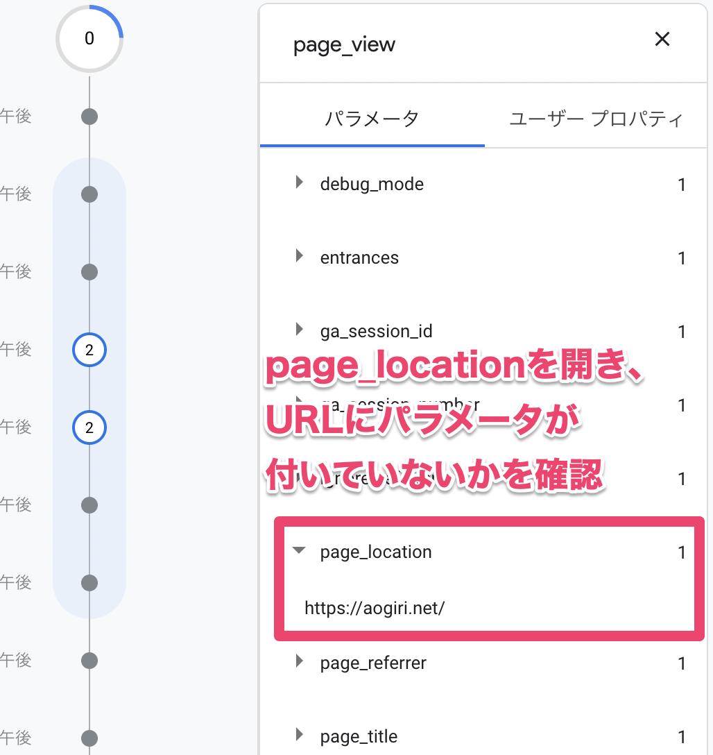 page_viewイベントのパラメータ一覧が表示されるので、「page_location」を開きます。