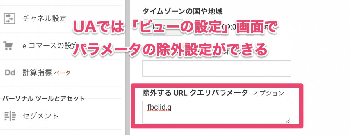 従来のGA(ユニバーサルアナリティクス)では、ビュー設定の画面で簡単にクエリパラメータの除外設定ができていました。