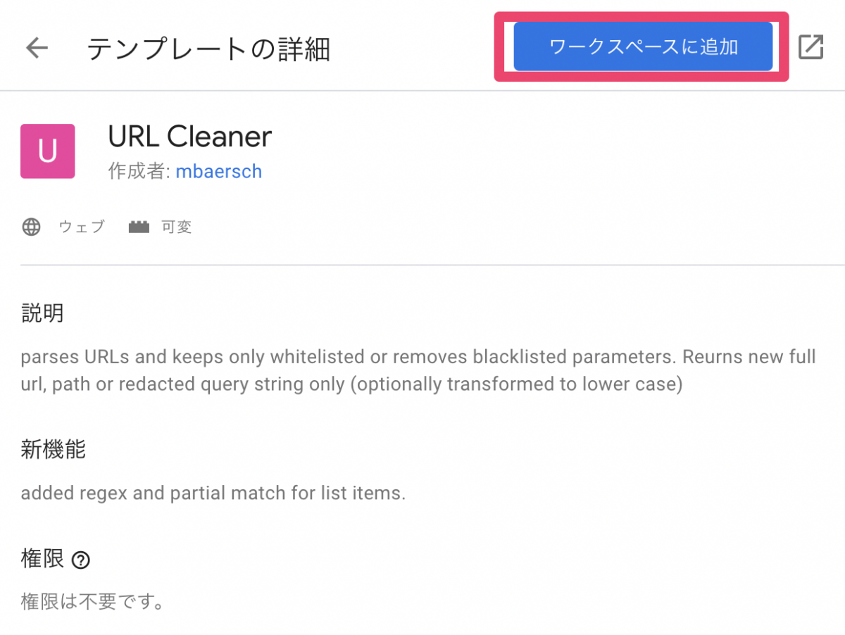 「テンプレートの詳細」画面が開くので、「ワークスペースに追加」をクリック