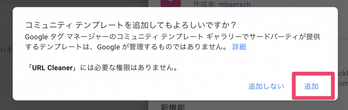 その後出てくるメッセージを確認し、「追加」をクリック