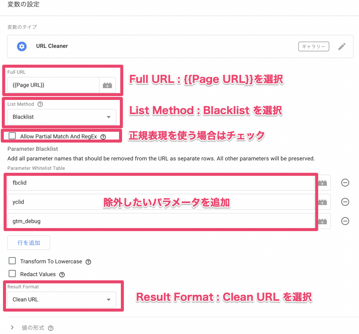 | Result Format | Clean URLを選択 | 置換後のフォーマット(パラメータ除去されたURL) |