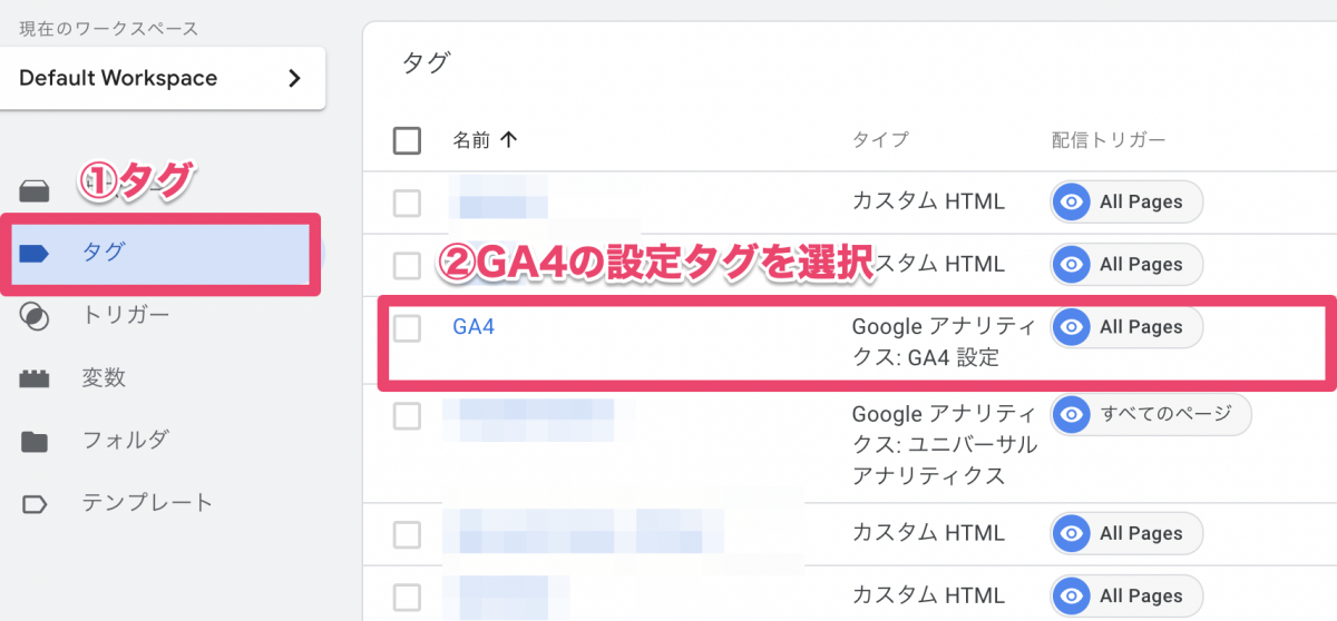 メニューから【タグ】を選択し、GA4が設定されてあるタグをクリック