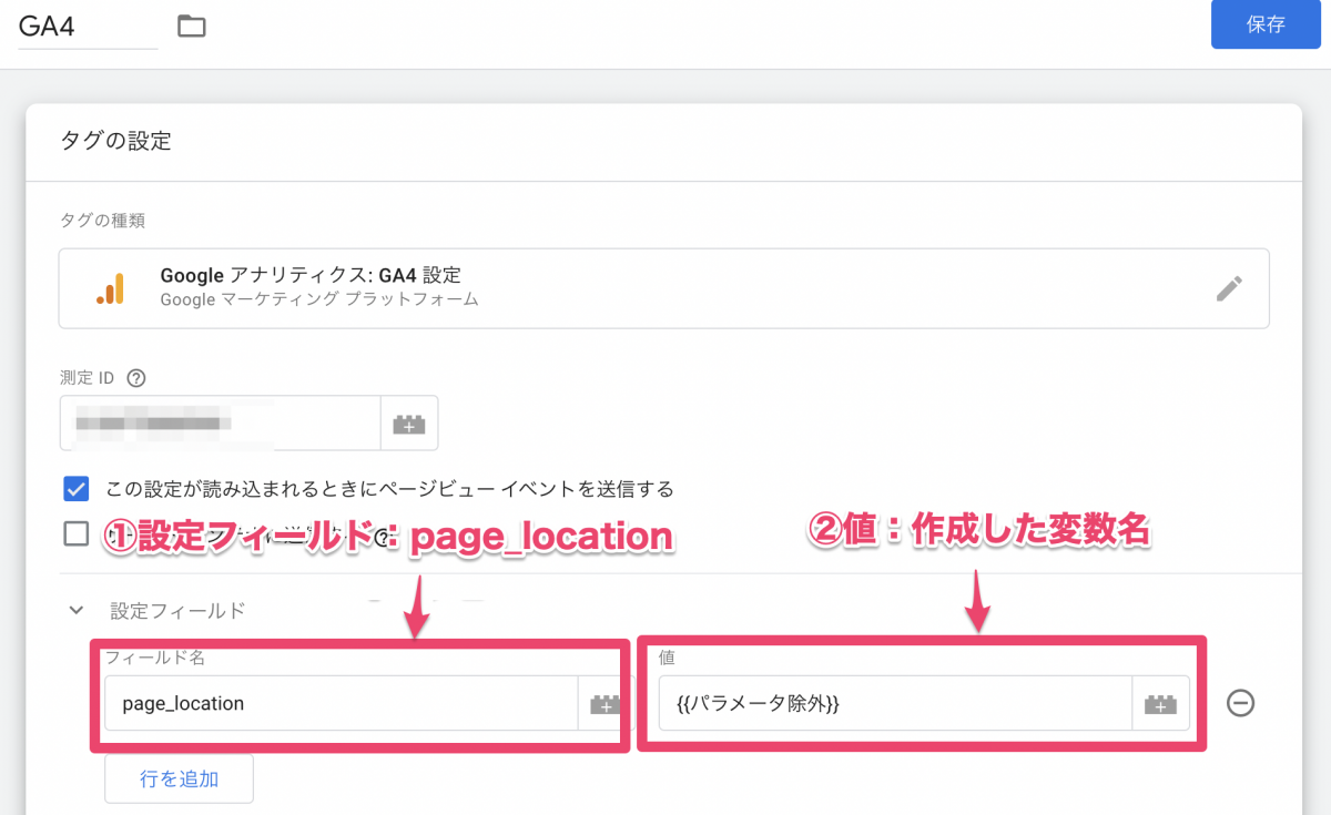 【設定フィールド】に page_location、