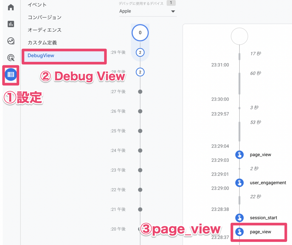 GA4画面から、【設定】→【Debug View】を開きます。